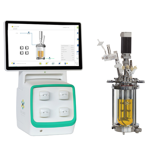 Solaris JUPITER ist eine modulare Plattform autoklavierbarer Benchtop-Fermenter/Bioreaktoren mit Glasgefäßen von 2 bis 10 l Gesamtvolumen. Solaris JUPITER unterstützt Batch-, Fed-Batch- und kontinuierliche Prozesse und lässt sich mit zahlreichen Mess- und Regeloptionen konfigurieren – auf Wunsch inklusive Druckregelung bis ca. 1,6 bar.